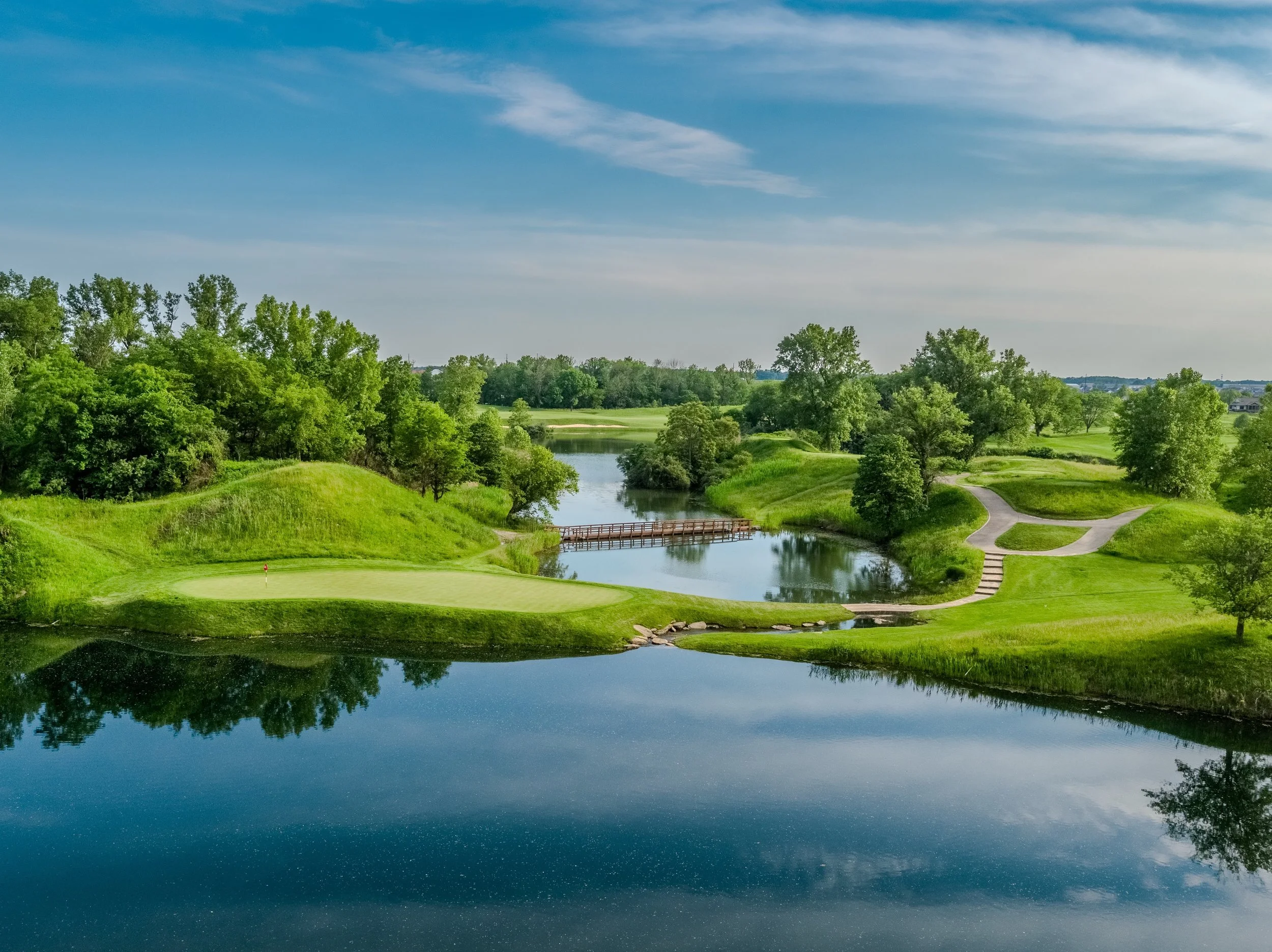 Tom Fazio’s design at Victoria National is the #1 course in Indiana. Trees frame expansive corridors of play, while deep freshwater lakes and sweeping bridges shape a landscape that feels both rugged and refined. Built on the site of a former coal mine, the property carries a subtle industrial character—its aggressive landforms and reclaimed terrain giving the course a bold, muscular presence. Native grasses and open vistas lend the feel of a prairie preserve, with each hole tying seamlessly into the natural contours of the land. It’s an experience visually striking at every turn.
